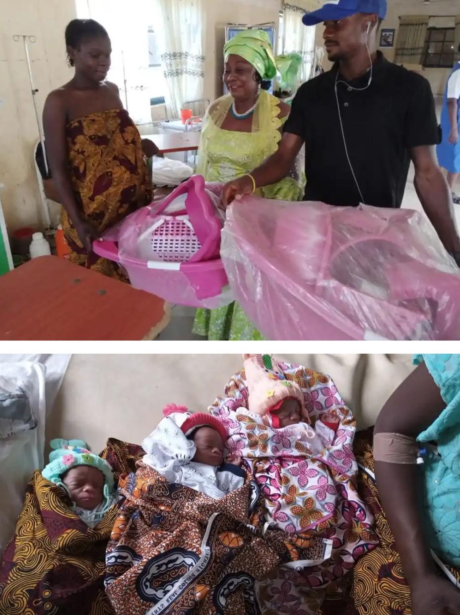 “Few days ago, on the 1-10-2020, this lady put to birth set of triplets, two girls and a boy. Immediately her attention was drawn to me, no baby food, no baby clothes, and same time unable to pay their bills.