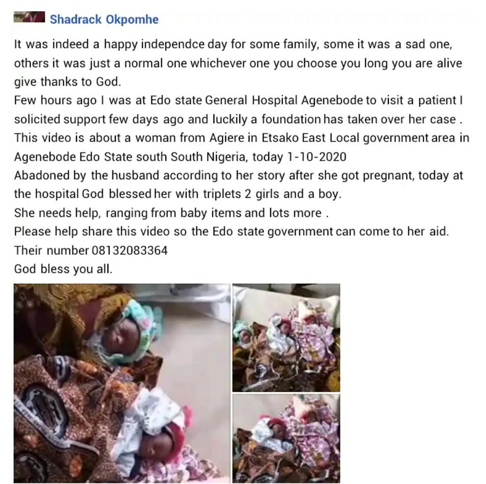 A Nigerian woman from Edo State, who was alegedly abandoned by her husband, has successfully given birth to triplets in Edo state.