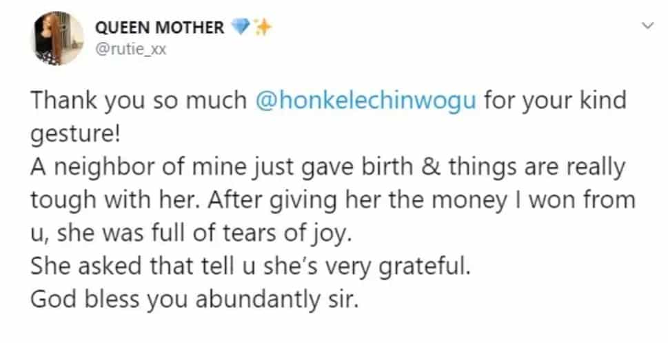 “Thank you so much @honkelechinwogu for your kind gesture! A neighbor of mine just gave birth & things are really tough with her. After giving her the money I won from u, she was full of tears of joy. She asked that tell u she’s very grateful. God bless you abundantly sir.”