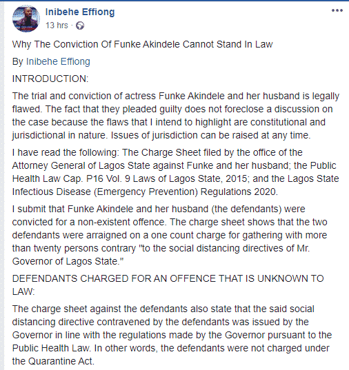A Nigerian lawyer has explained why Funke Akindele and JJC Skillz’s conviction for violating a lockdown order issued by the Lagos state government, cannot stand in law.