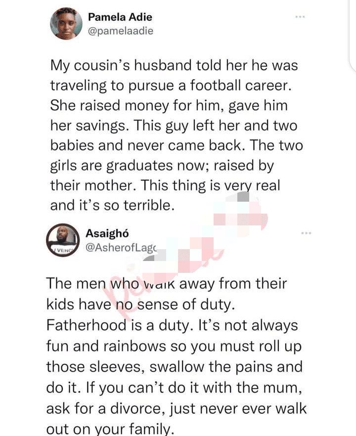 “My cousin’s husband told her he was travelling to pursue a football career. She raised money for him, gave him her savings. This guy left her and two babies and never came back. The two girls are graduates now; raised by their mother. This thing is very real and it’s so terrible.”