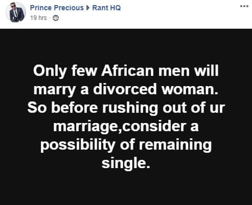 A Nigerian , Prince Precious, in a Facebook post directed to women ‘rushing’ out of marriage, claimed that ‘only few African men will marry a divorced woman’.