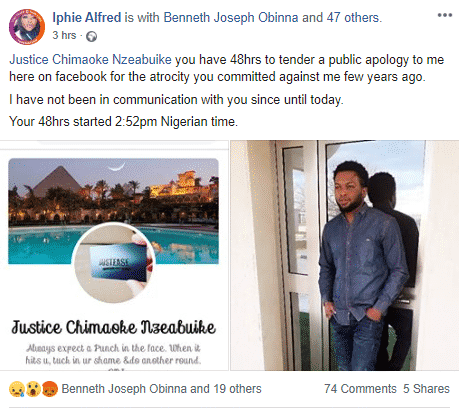 ”Justice Chimaoke Nzeabuike you have 48hrs to tender a public apology to me here on facebook for the atrocity you committed against me few years ago.