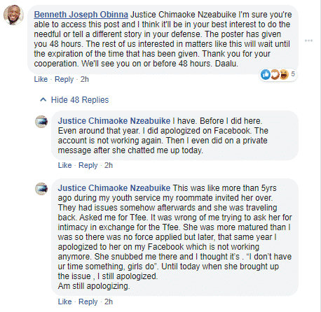 Following her post, Justice took to the comment section to apologize and also state his own side of the story. He revealed that the incident happened over five years ago when he was serving.