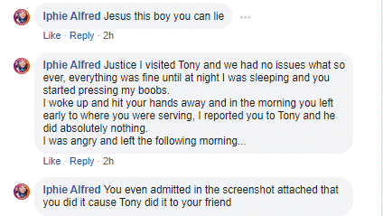Iphie saw his comment and expressed shock at his claim. According to her, she and Tony never had issues. She claimed that it was while she was asleep at night that Justice began to fondle her boobs.