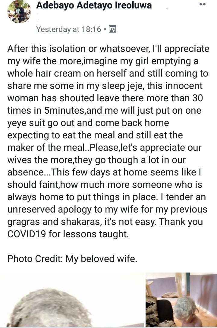 “Please, let’s appreciate our wives the more,they go though a lot in our absence…This few days at home seems like I should faint,how much more someone who is always home to put things in place. I tender an unreserved apology to my wife for my previous gragras and shakaras, it’s not easy. Thank you COVID19 for lessons taught.”