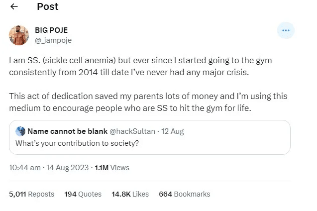 Known on Twitter as @_iampoje, he has disclosed that he stumbled upon a secret method to combat the challenges of the disease by engaging in regular gym workouts, resulting in a remarkable reduction in major sickle cell crises.