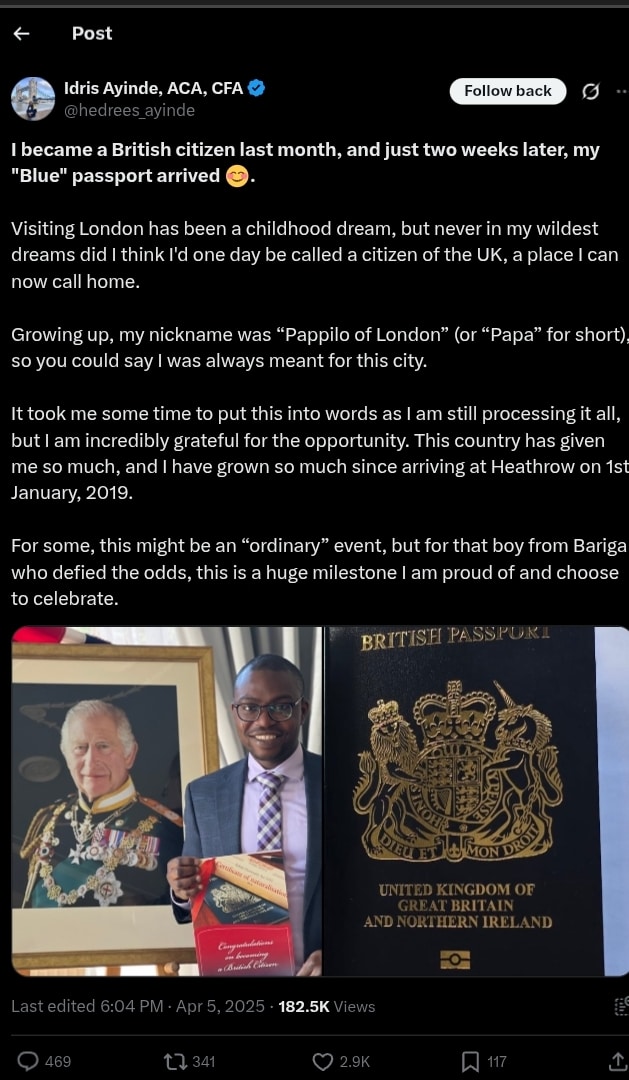 He proudly flaunted his new British passport in a heartfelt post shared on his X (formerly Twitter) page.