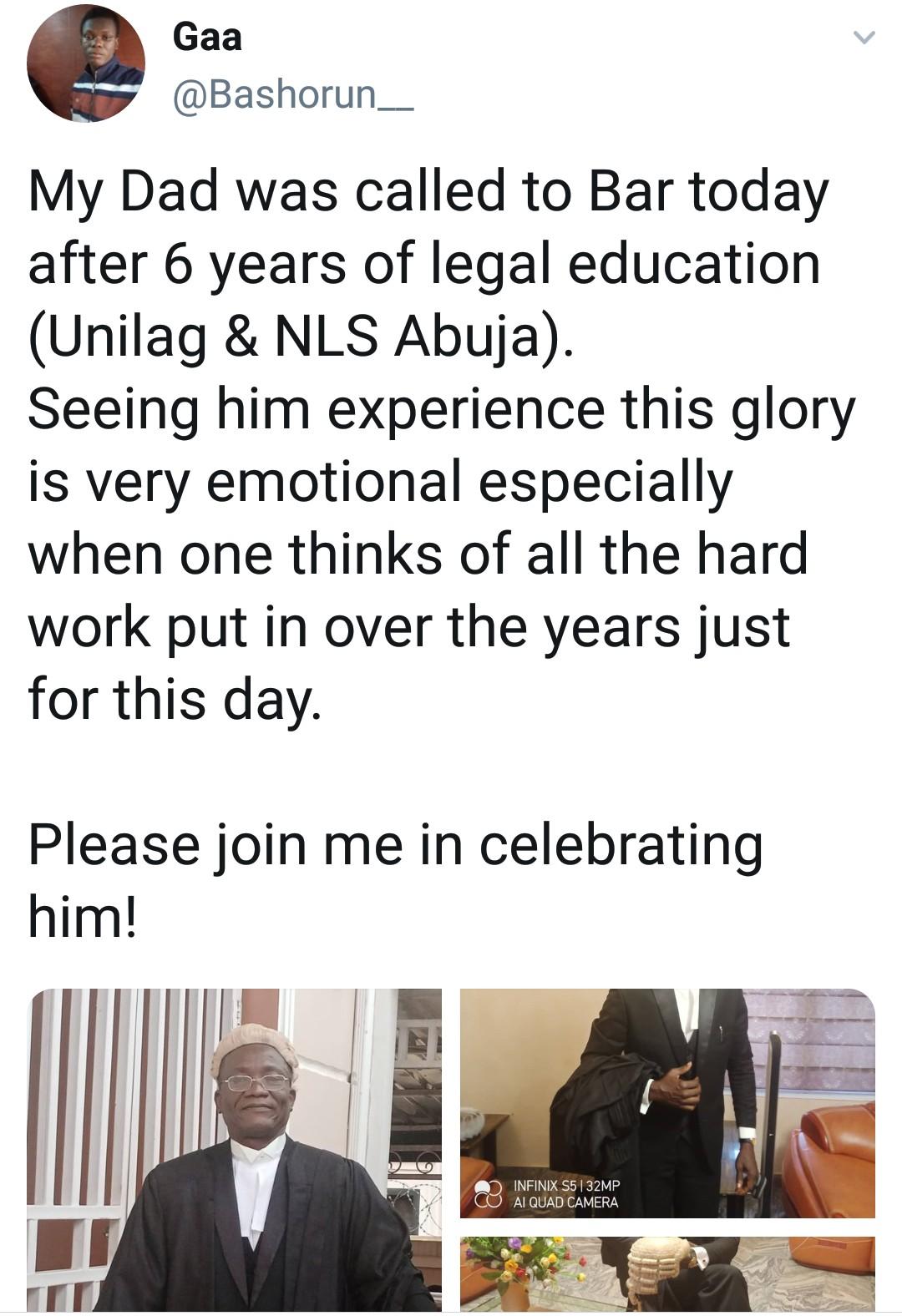 Twitter user, Bashorun has taken to the platform to celebrate his father who was called to Bar after 6 years of legal education and hardwork.