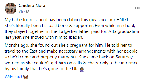 “She’s literally been his backbone & supporter. Even while in school, they stayed together in the lodge her father paid for. Afta graduation last year, she moved with him to Ibadan. “Months ago, she found out she’s pregnant for him. He told her to travel to the East and make necessary arrangements with her people so he’d come and properly marry her. She came back on Saturday, worried as she couldn’t get him on calls & chats, only to be informed by his family that he’s gone to the UK.”