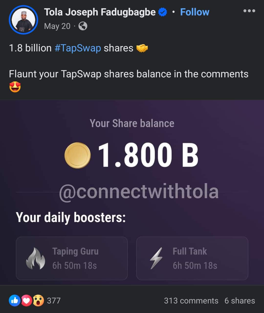 The man, who goes by the name Tola Joseph Fadugbagbe, shared a screenshot of his TapSwap balance on his timeline while encouraging others to do the same.