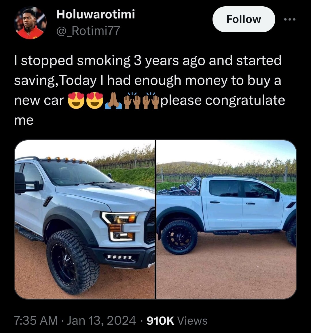 A Nigerian man has shown off the multi-million naira car he recently purchased with his savings from the past 3 years, after quitting smoking.