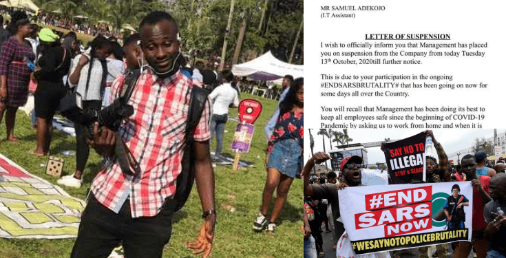 A Nigerian man, Samuel Adekojo shared photos of the suspension letter he got from his boss after joining #EndSARS protest.