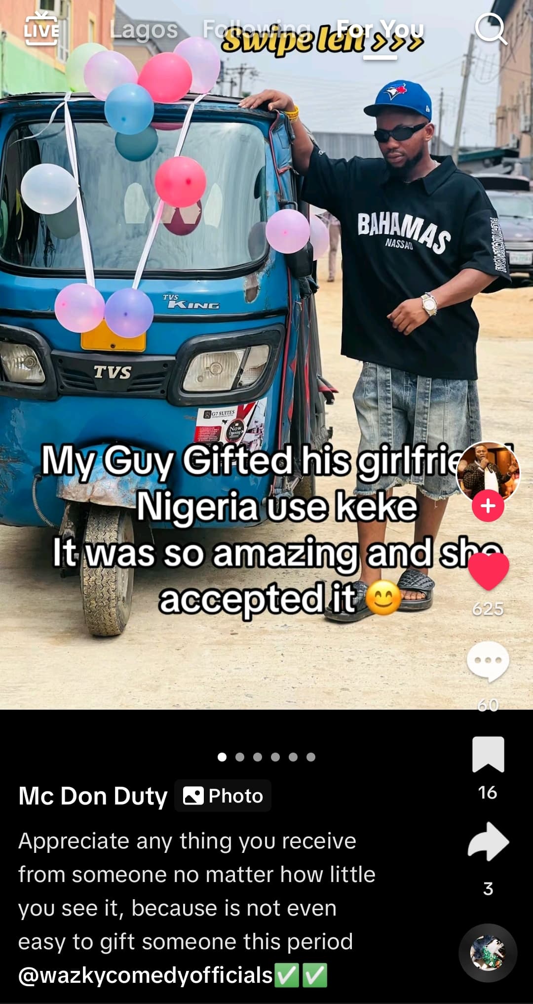 A Nigerian man impressed many on social media by gifting his girlfriend a fairly used tricycle to appreciate her for always supporting him.