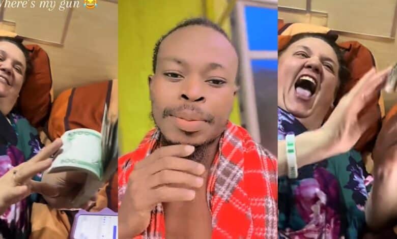 Nigerian man gushes as rich caucasian lover flaunts wad of Naira, hides it in gown for him to find
