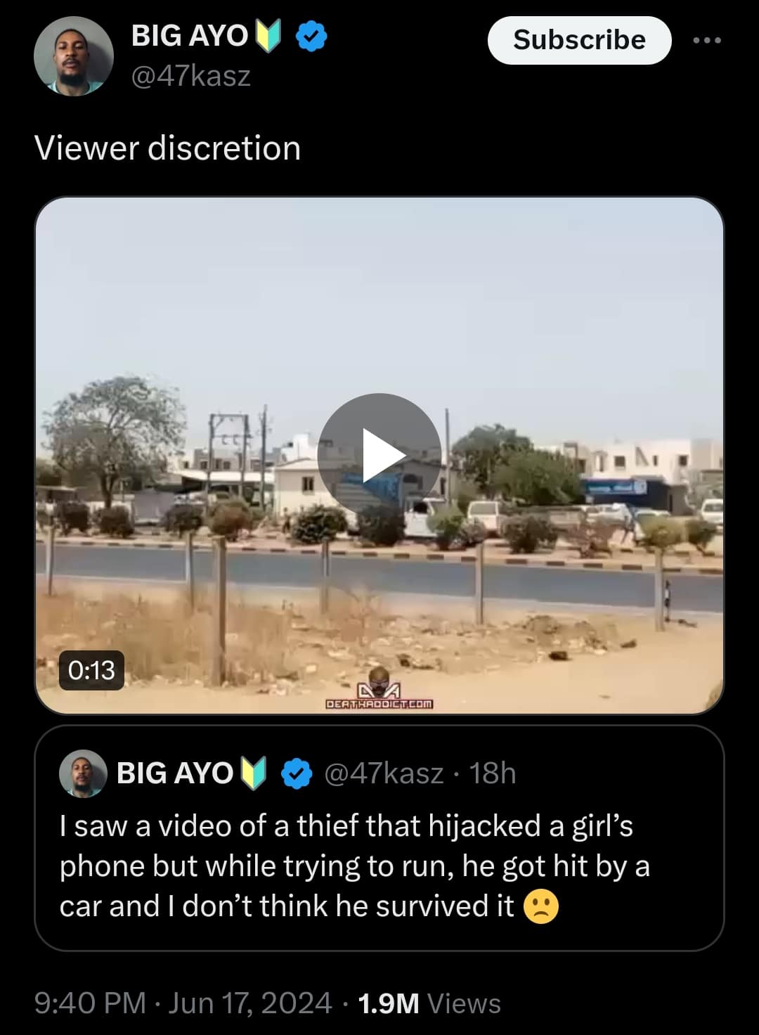 His statement: “I saw a video of a thief who hijacked a girl’s phone, but while trying to run, he got hit by a car, and I don’t think he survived it.”
