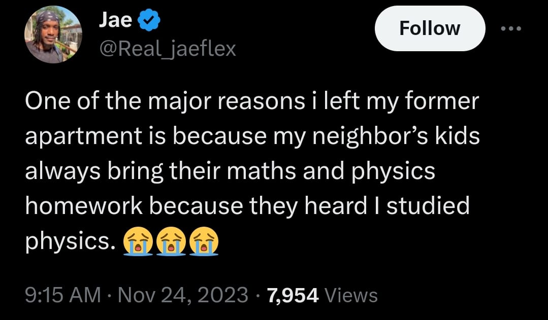 Nigerian man moves out of apartment because his neighbor’s kids always bring their math and physics homework