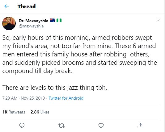 He wrote: “So, early hours of this morning, armed robbers swept my friend’s area, not too far from mine. These 6 armed men entered this family house after robbing others, and suddenly picked brooms and started sweeping the compound till day break. There are levels to this jazz thing tbh.”