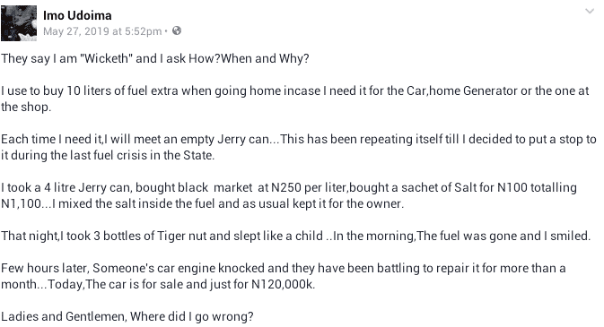 Facebook user, Imo Udoima from Akwa Ibom took to the social media page to narrate how he got back at a neighbour, who has been pilfering his fuel. Read below.