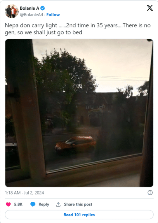 In his post, the man humorously remarked, “NEPA don carry light,” a phrase commonly used in Nigeria.