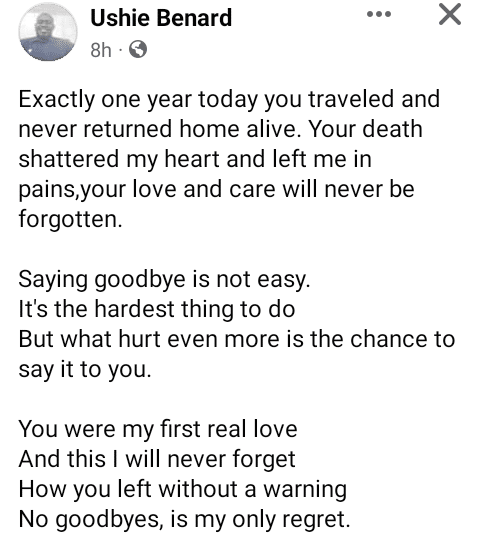 He wrote: “Exactly one year today you traveled and never returned home alive. Your death shattered my heart and left me in pains, your love and care will never be forgotten.