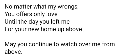 No matter what my wrongs, You offers only love Until the day you left me For your new home up above. May you continue to watch over me from above.