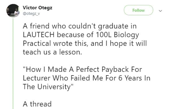 Nigerian man recounts how he paid back a lecturer who failed him in a particular course for six years in LAUTECH.