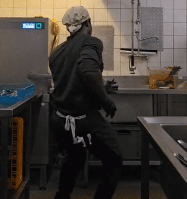 The man, who recently relocated to the continent, posted a video of himself joyfully dancing while washing plates at his new job.