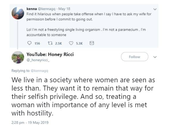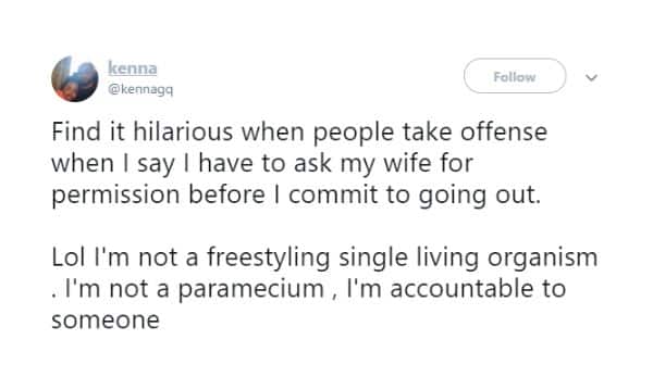 “Find it hilarious when people take offense when I say I have to ask my wife for permission before I commit to going out. Lol I’m not a freestyling single living organism . I’m not a paramecium , I’m accountable to someone.”