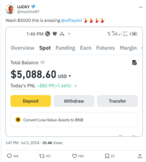 Femi, who recently disclosed his reason for not keeping the money, expressed his gratitude as his crypto wallet balance now soared to over $5,000 (more than N7.5 million)