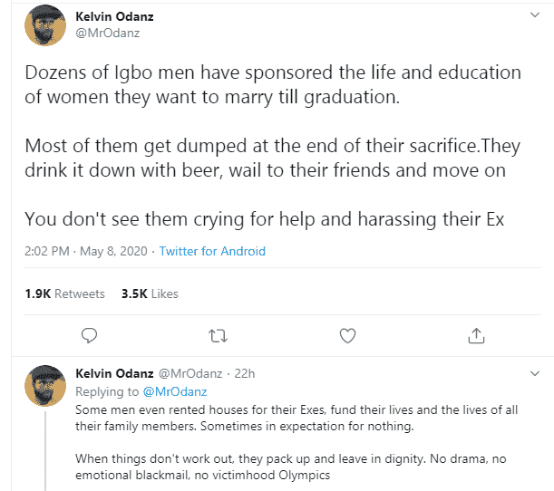 “Dozens of Igbo men have sponsored the life and education of women they want to marry till graduation. Most of them get dumped at the end of their sacrifice.They drink it down with beer, wail to their friends and move on You don’t see them crying for help and harassing their Ex