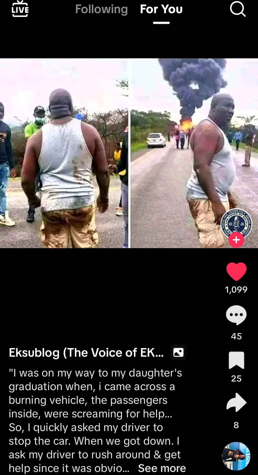 The caption of the post detailing the incident reads: “I was on my way to my daughter’s graduation when I came across a burning vehicle. The passengers inside were screaming for help.”