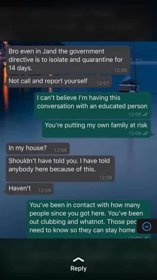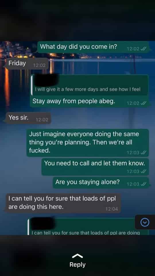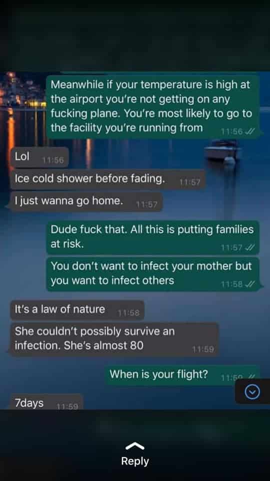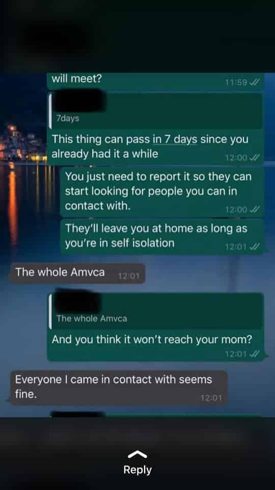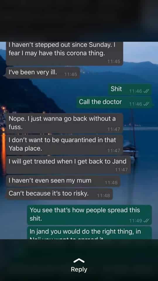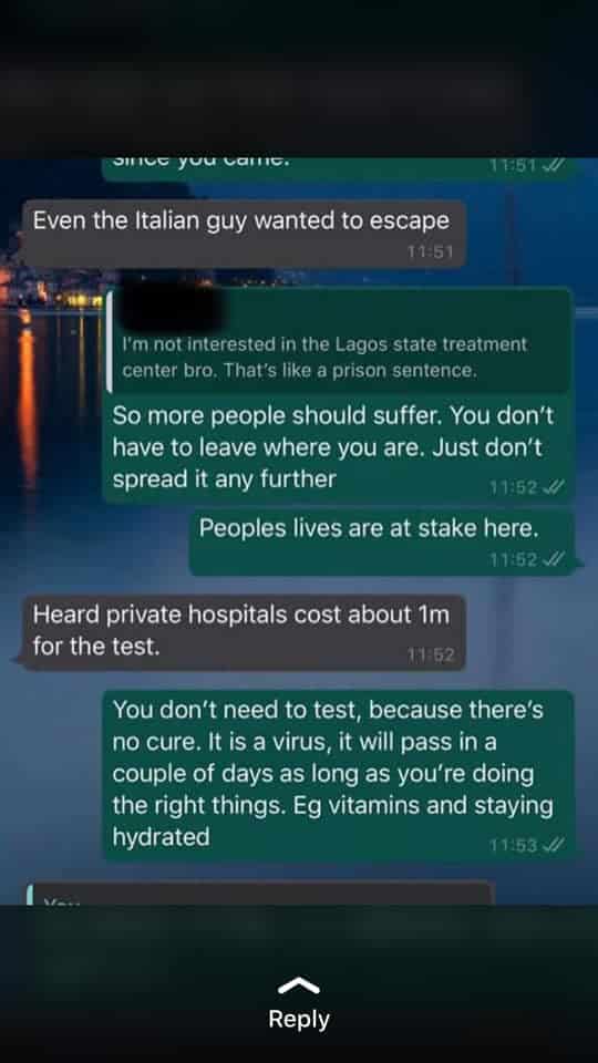 Seun who disclosed that he was referred to the Lagos State Government after he went to Lagoon hospital in Victoria Island to get tested, also confirmed that screenshots of a Whatsapp chat which has gone viral online was a conversation he had with a friend.