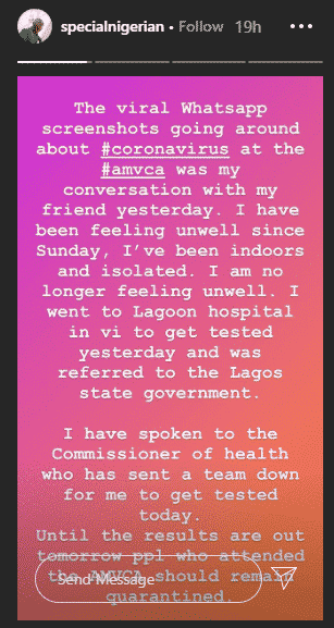 The Nigerian man who reportedly showed symptoms of coronavirus after attending the 7th edition of the AMVCA last weekend, has gone public with his own side of the story.