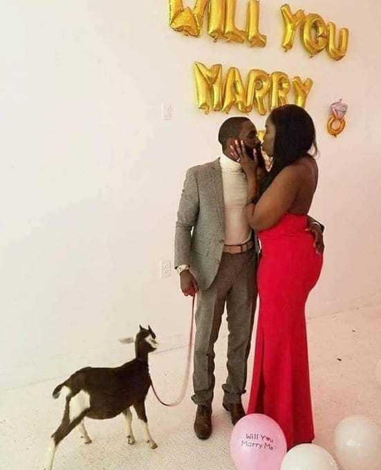 A man has defiled the common use of an engagement ring for marriage proposals as he uses a goat to make an official marriage proposal to his girlfriend.