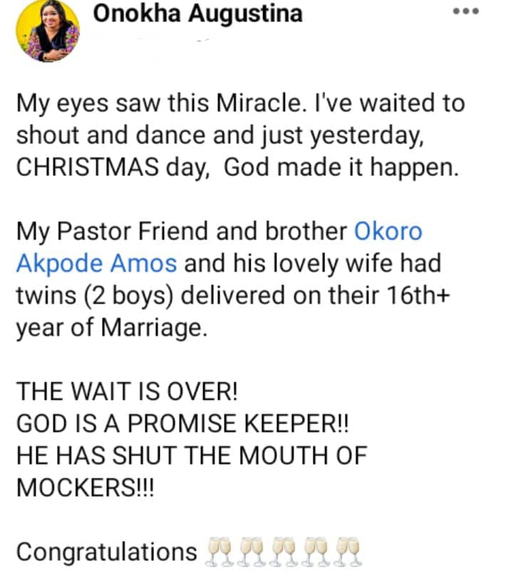 The pastor, Okoro Akpode Amos, and his wife, Grace, had their set of twins after 16 years of marriage.