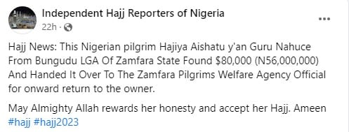 Sharing her photo, the reporter wrote, “This Nigerian pilgrim Hajiya Aishatu y’an Guru Nahuce from Bungudu LGA of Zamfara State found $80,000 (N56,000,000) and handed it over to the Zamfara Pilgrims Welfare Agency official for onward return to the owner. May Almighty Allah rewards her honesty and accept her Hajj. Amen.”