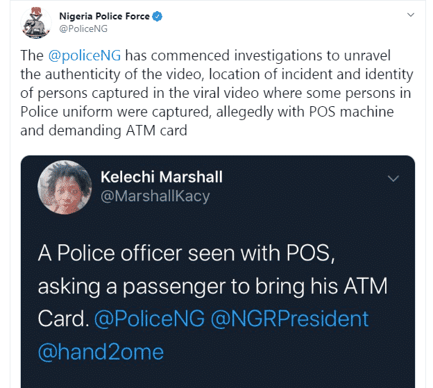 “The Nigerian Police Force has commenced investigations to unravel the authenticity of the video, location of incident and identity of persons captured in the viral video where some persons in Police uniform were captured, allegedly with POS machine and demanding ATM card from a member of the public.