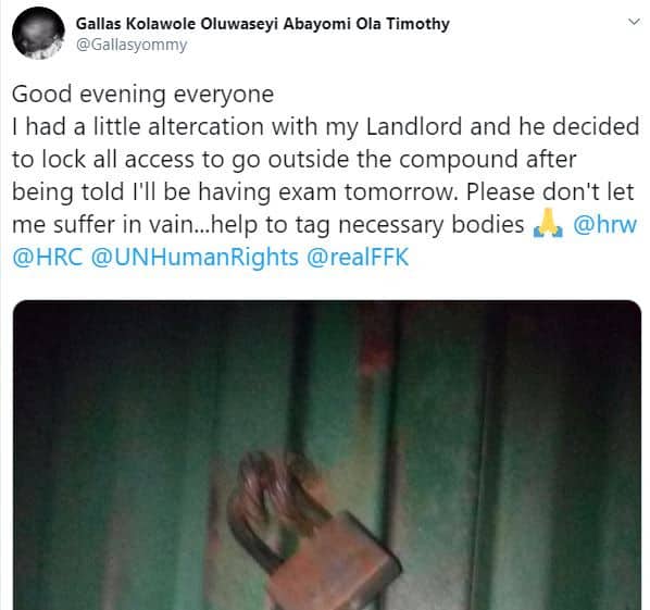 According to him, ‘my Landlord decided 2lock me inside d house so as not to go out because of little altercation. Am supposed to write exam this morning but it’s now mission impossible’.
