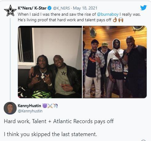 In reaction, a fan took to comment session to correct K-Ners’ take on Burna Boy while affirming that he missed the actual point that led to Burna’s greatness which has everything to do with Atlantic Music Records.