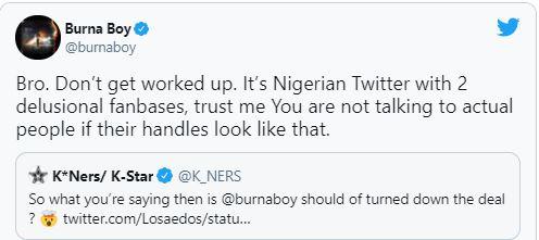 Burna Boy, however, interfered by advising K-Ners to ignore chitchat with Nigerian fans as most of them are products of ‘2 delusional fanbases.’