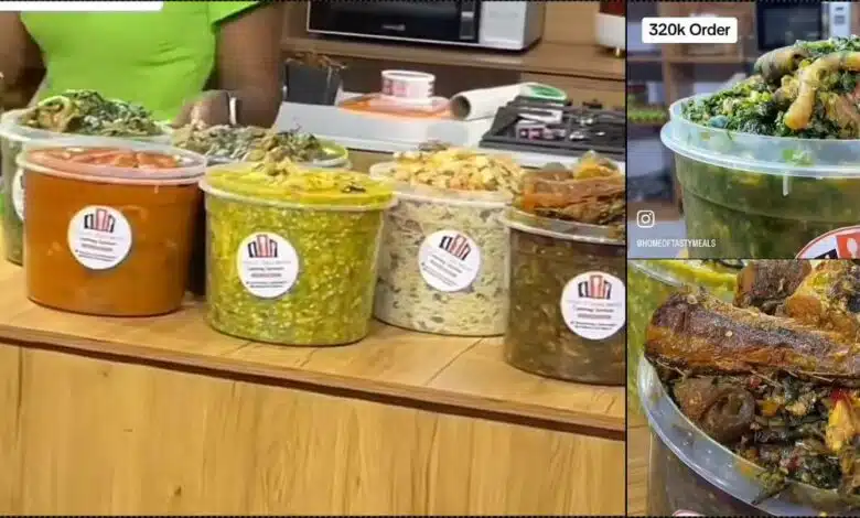 A Nigerian vendor flaunts different mouthwatering soups and fried rice worth N320K ready to be flown abroad to a client in America.