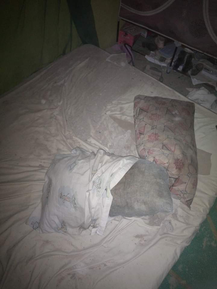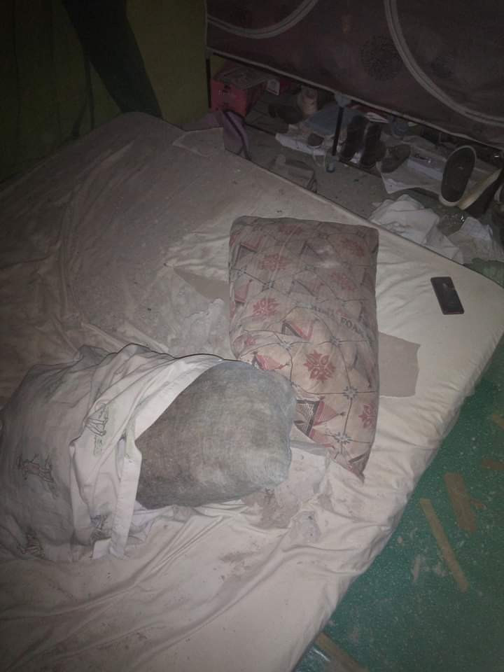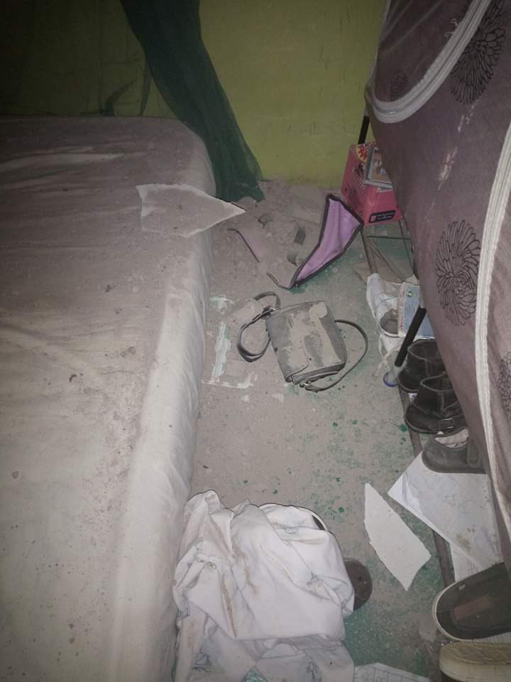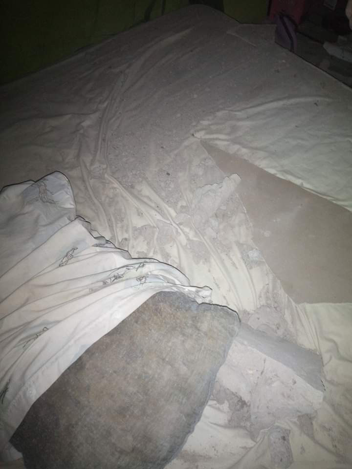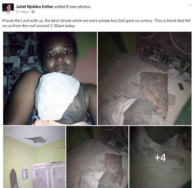 “Praise the Lord with us, the devil struck while we were asleep but God gave us victory. This is block that fell on us from the roof around 2:30am today”