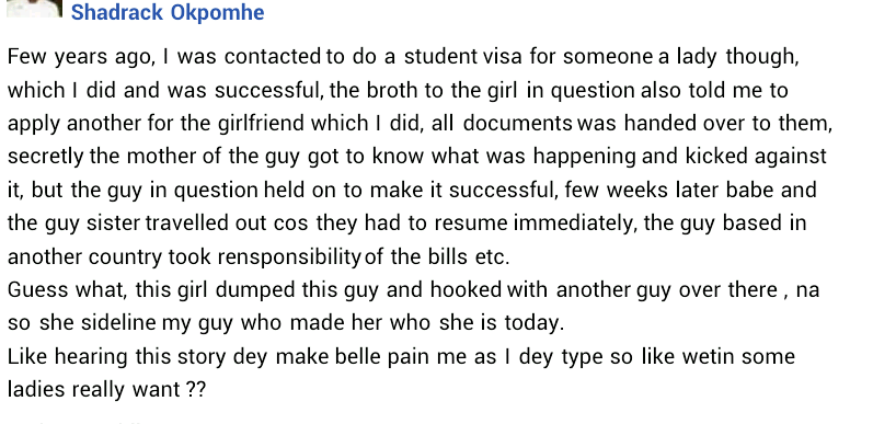 “Guess what, this girl dumped this guy and hooked with another guy over there , na so she sideline my guy who made her who she is today. Like hearing this story dey make belle pain me as I dey type so like wetin some ladies really want??”