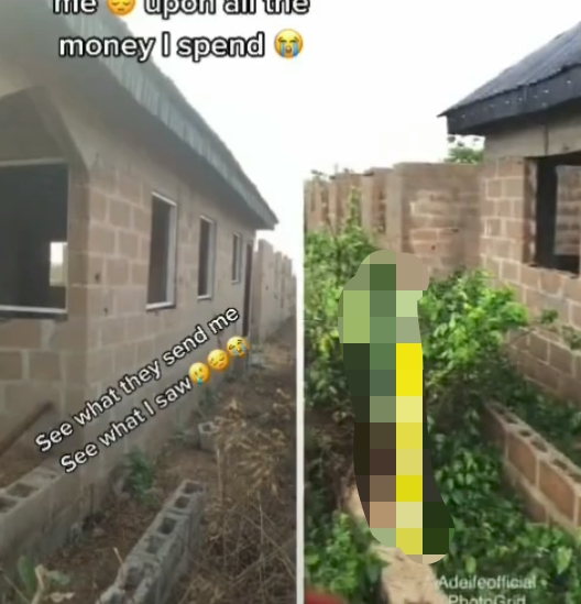 The lady had come back home with high expectations to see a beautifully erected building only for her to see a partially completed house with grasses growing around it.