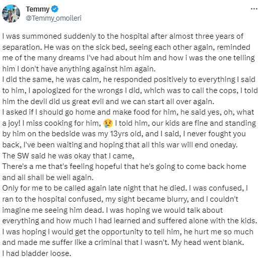 Temmy Omoileri, a Nigerian woman, took to Twitter to share her heart-wrenching journey of reconciliation with her estranged husband, only to witness his sudden passing shortly after their emotional reunion.