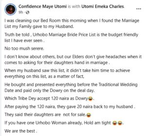 “I was cleaning our bedroom this morning when I found the Marriage List my Family gave to my Husband. Truth be told, Urhobo Marriage Bride Price List is the most budget friendly list I have ever seen,” she wrote in a Facebook post on Thursday.
