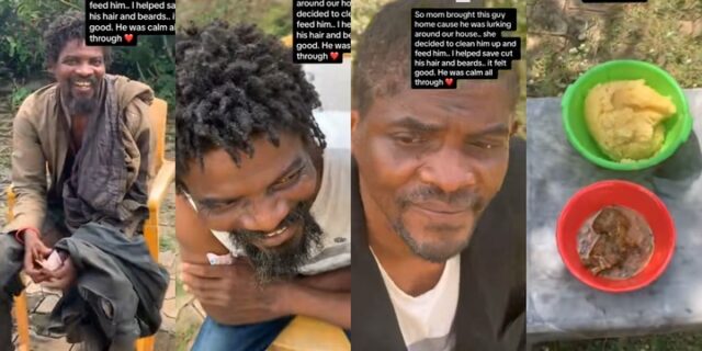 Nigerian woman transforms homeless man lurking around, gives him clothes, food, cuts off his dreads and beard