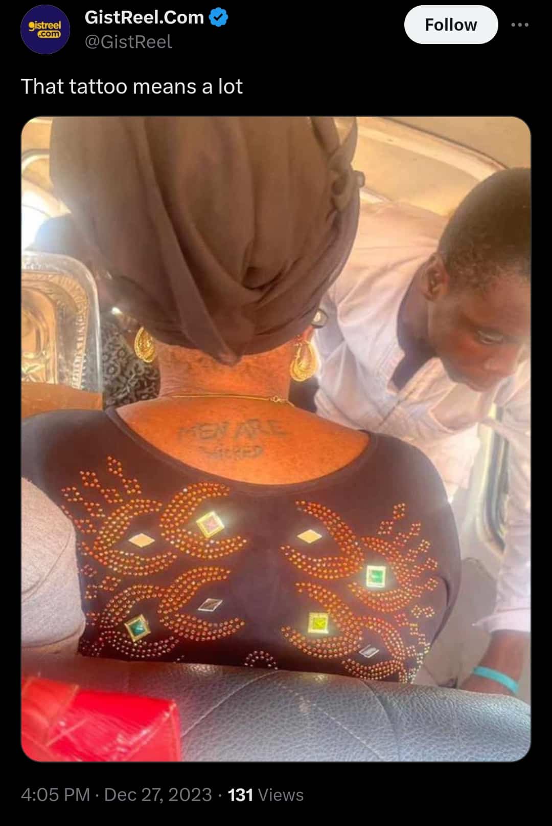 The tattoo, which reads “Men are wicked,” was prominently displayed on the lady’s back as she occupied the passenger seat.