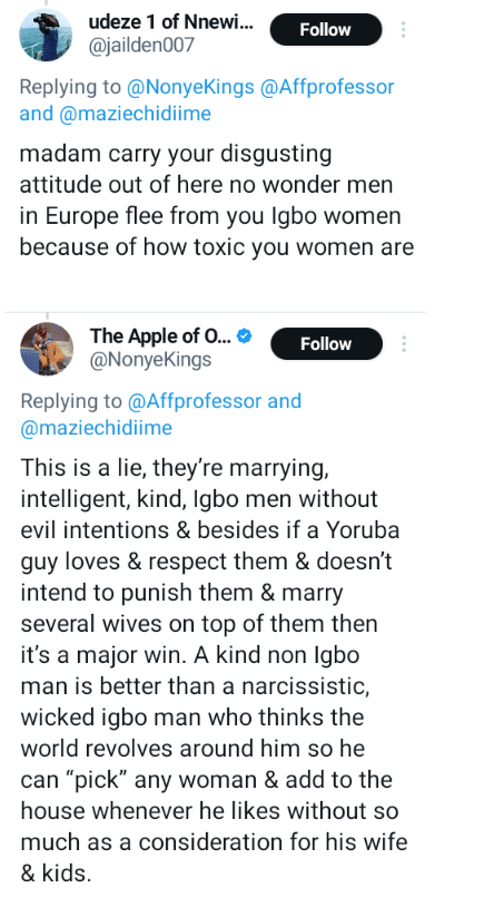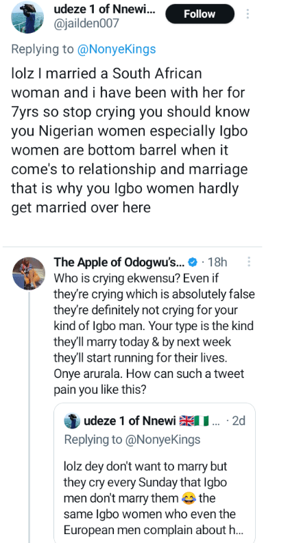 “lolz I married a South African woman and I have been with her for 7 years so stop crying. You should know you Nigerian women especially Igbo women are bottom barrel when it comes to relationships and marriage; that is why you Igbo women hardly get married over here,” Udeze commented in response to Odu’s tweet.